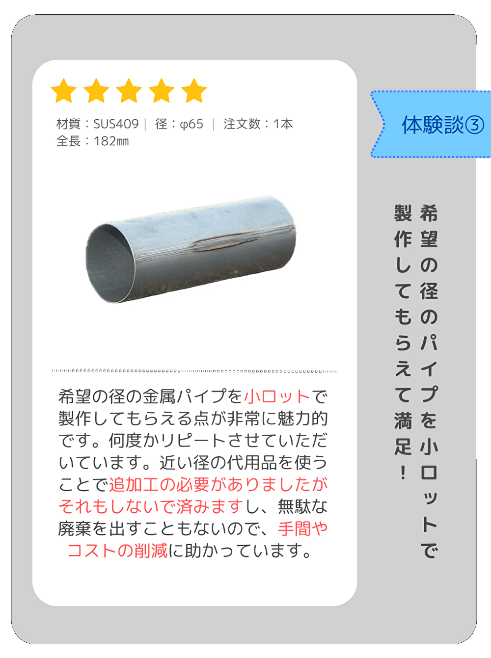 完全受注生産ですので、ご指定の径、長さ、板厚、素材のパイプをご要望の数だけ製造することができます。